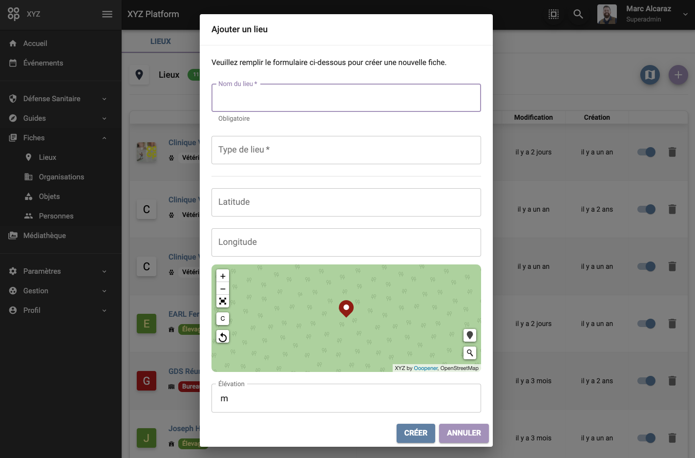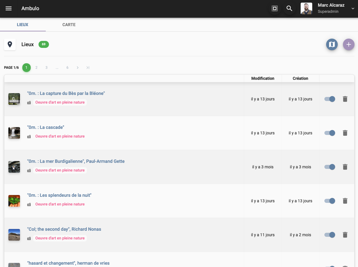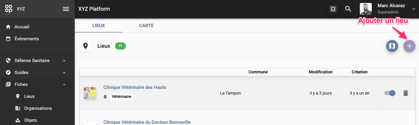 La page Lieux permet de gérer l'ensemble des enregistrements de type lieu de la plateforme.