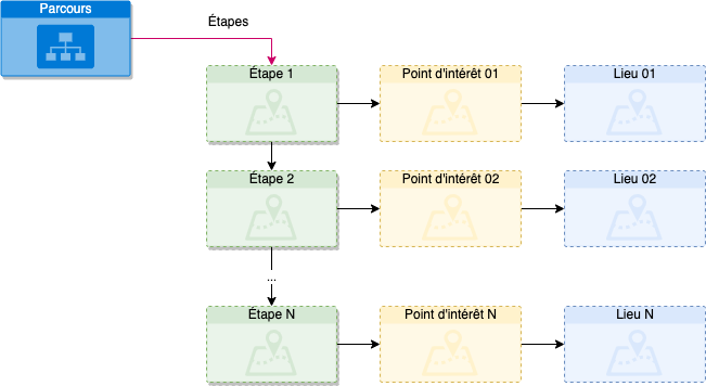 Un parcours est constitué d'étapes. Chaque étape cible un point d'intérêt spécifique qui lui même cible un lieu.
