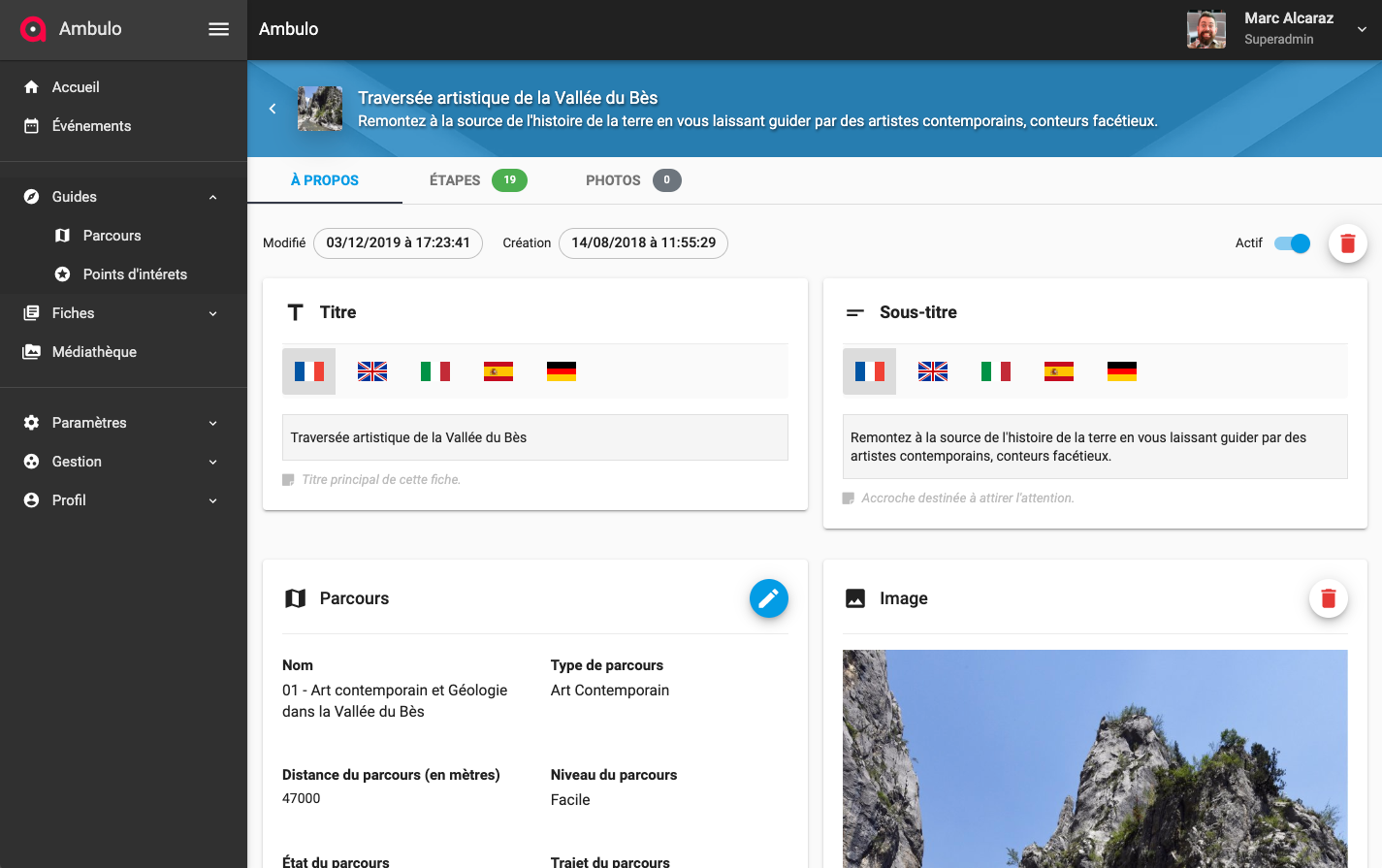 En cliquant sur le titre d’un point d’intérêt dans la liste, il sera possible d’ouvrir la fiche du point d’intérêt sélectionné pour éditer son contenu Sur la droite de chaque ligne du tableau, dans les options de chaque enregistrement, il est possible de supprimer une entrée et d’activer ou désactiver chaque POI dans les recherches de la plateforme.